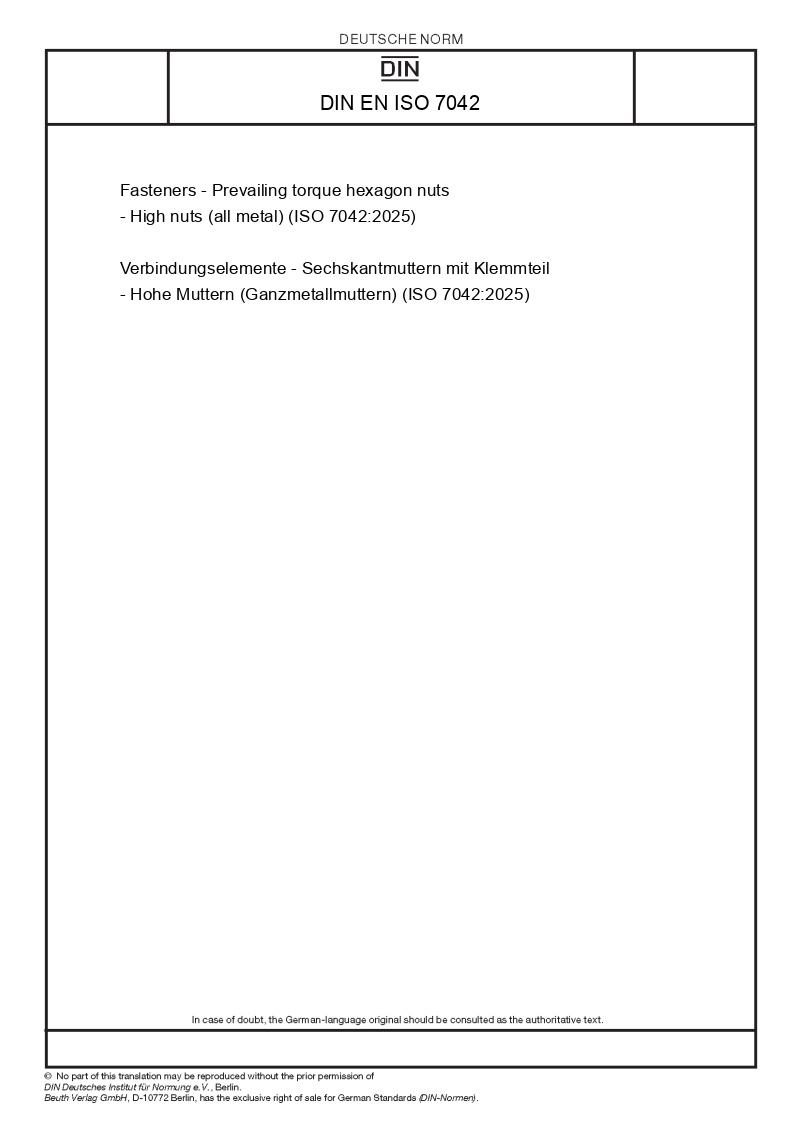 Fasteners - Prevailing torque hexagon nuts - High nuts (all metal) (ISO 7042:2025)