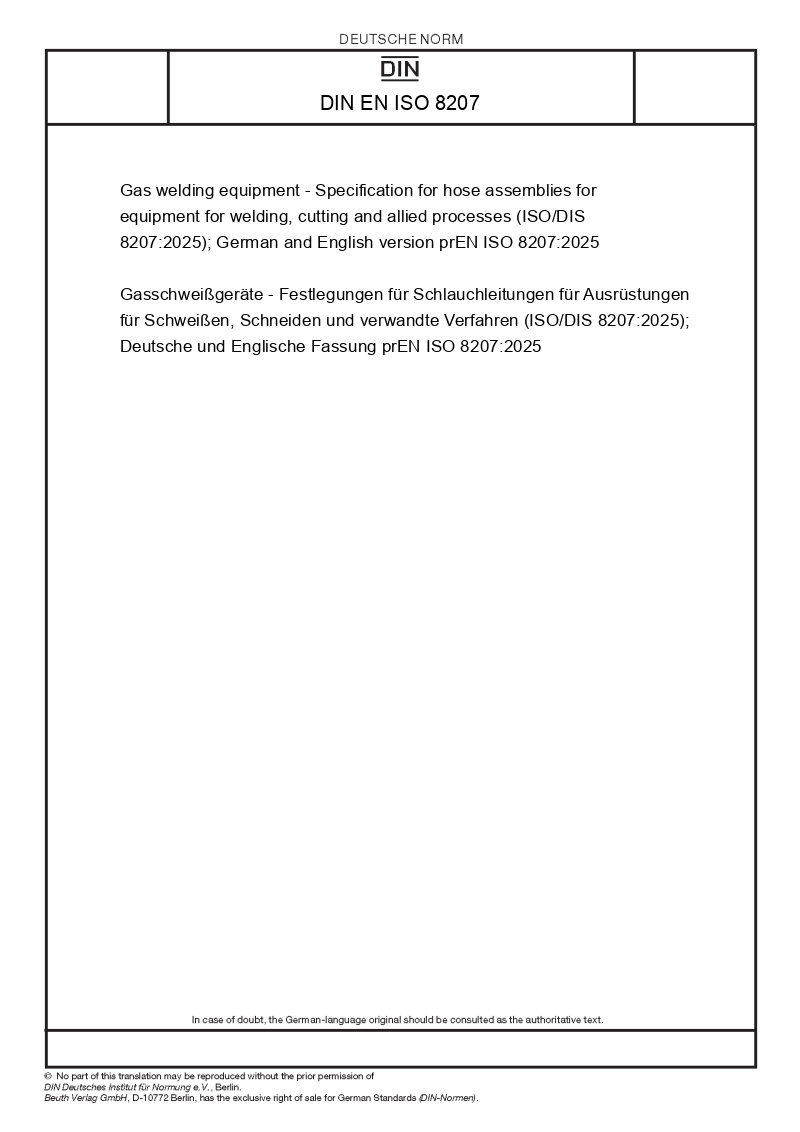 Gas welding equipment - Specification for hose assemblies for equipment for welding, cutting and allied processes (ISO/DIS 8207:2025); German and English version prEN ISO 8207:2025
