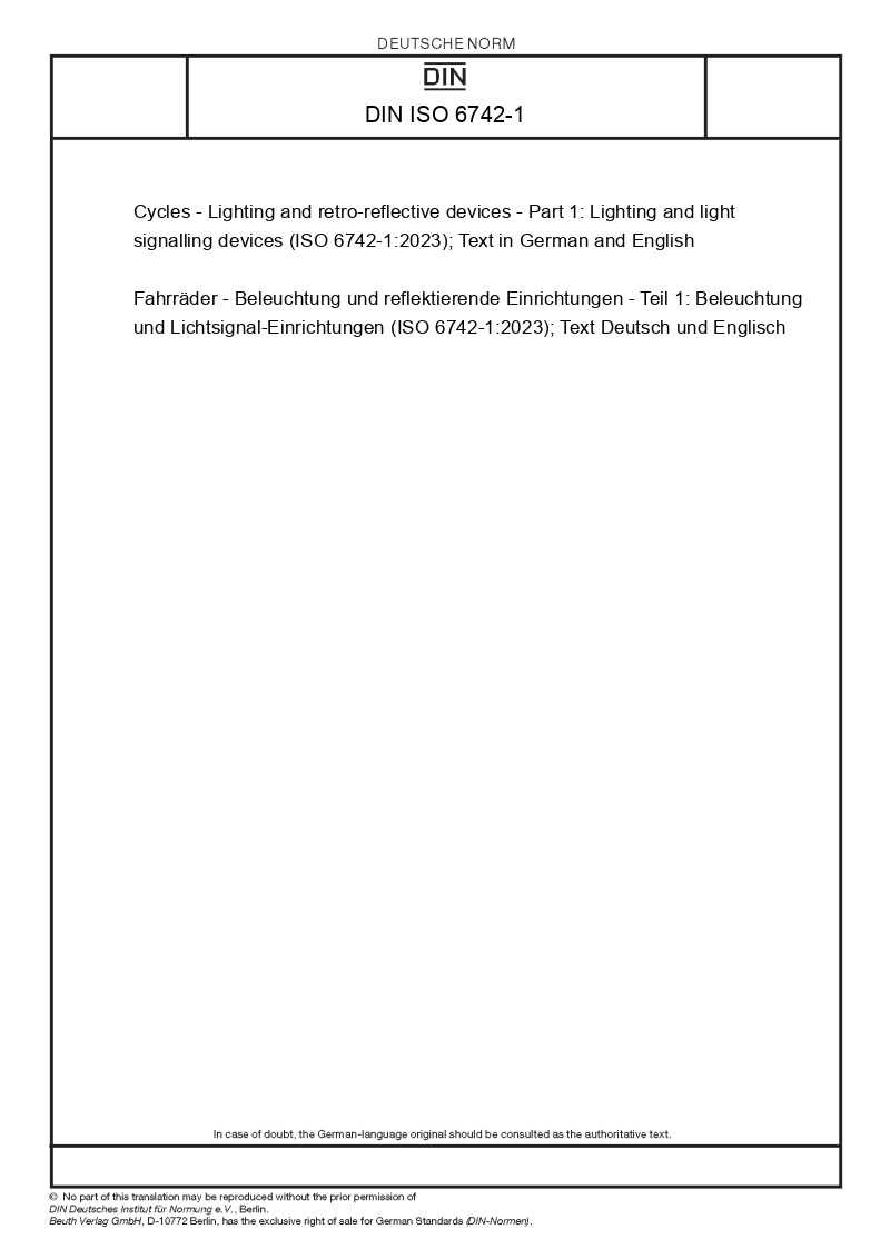 Cycles - Lighting and retro-reflective devices - Part 1: Lighting and light signalling devices (ISO 6742-1:2023); Text in German and English