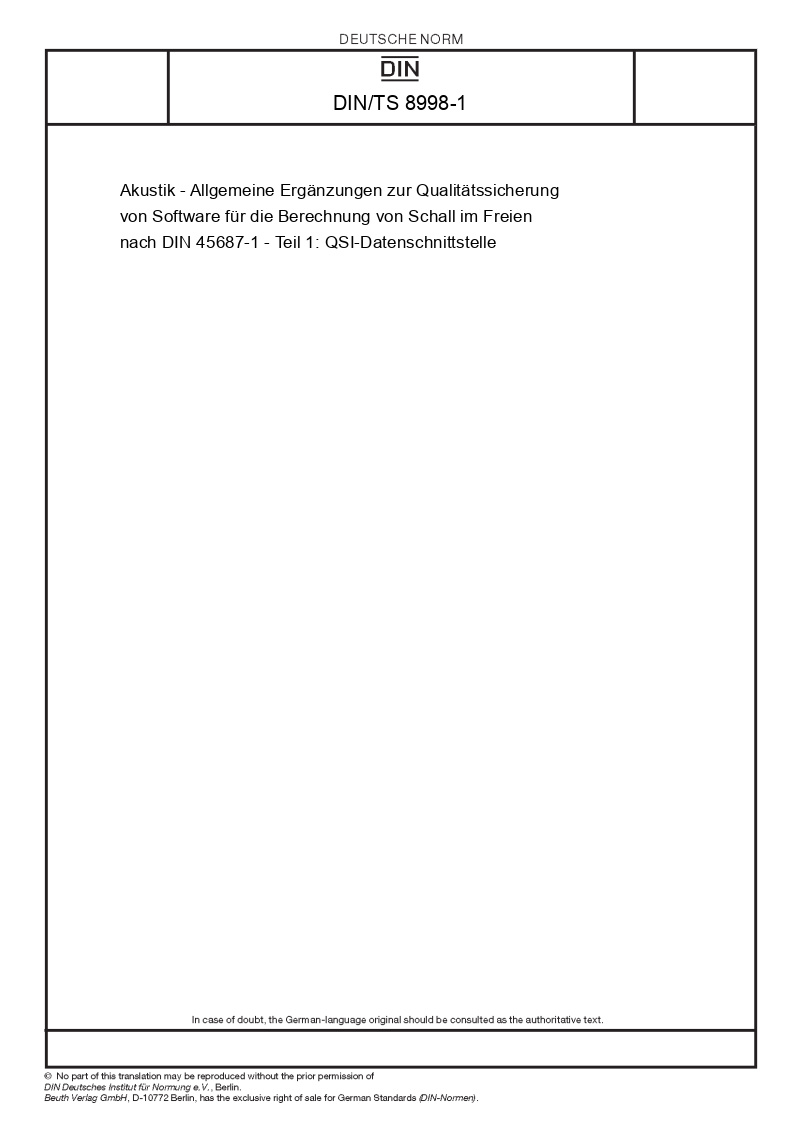 | Název produktu: | Akustik - Allgemeine Ergänzungen zur Qualitätssicherung von Software für die Berechnung von Schall im Freien nach DIN 45687-1 - Teil 1: QSI-Datenschnittstelle |