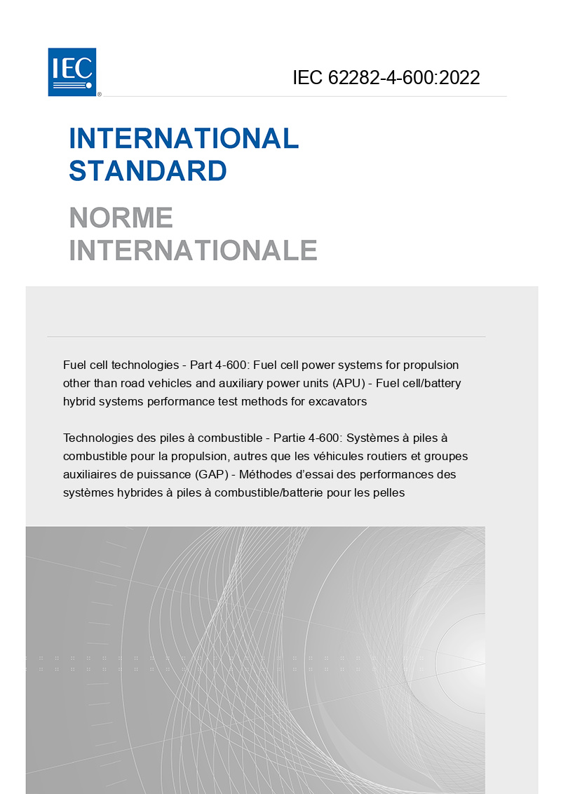 >IEC 62282-4-600:2022 - Fuel cell technologies - Part 4-600: Fuel cell power systems for propulsion other than road vehicles and auxiliary power units (APU) - Fuel cell/battery hybrid systems performance test methods for excavators