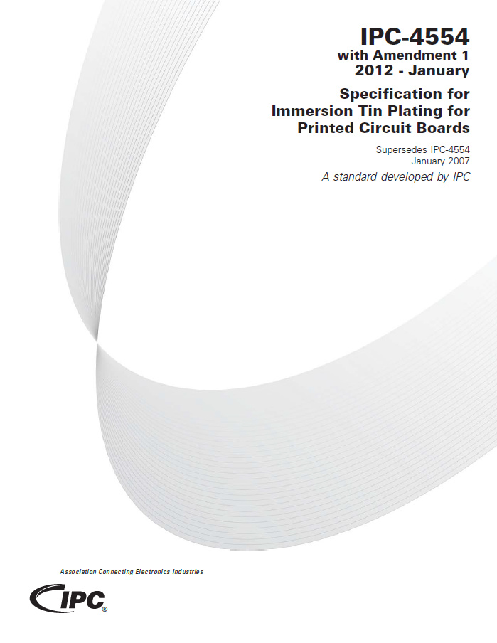 IPC-4554, Specification for Immersion Tin Plating for Printed Circuit Boards, is included in the IPC-455X series of specifications that set the requirements for printed board surface finishes that are alternates to non-coplanar finishes, most often referred to as tin-lead HASL finish. This specification is a full-color document that is intended for use by the supplier or printed board fabricator, plating chemistry supplier, contract assembler or EMS facility and the original equipment manufacturer (OEM). The immersion tin (Sn) is a metallic finish deposited by a chemical displacement reaction that is applied directly to the basis metal of the printed board, which is copper. The immersion tin is primarily used as a solderable surface for attachment of components. It may also be used when press fit connections are employed and for zero insertion force (ZIF) edge connectors. The immersion tin finish protects the underlying copper from oxidation over the intended shelf life of this finish that is described in IPC/EIA J-STD-003 as a Category 3 coating durability finish (storage of greater than six months). The inserted Amendment 1 provides more detail on the solderability of the immersion tin, using both tin-lead as well as "lead-free" solders using appropriate fluxes. 48 pages. Released with Amendment 1: January 2012.
