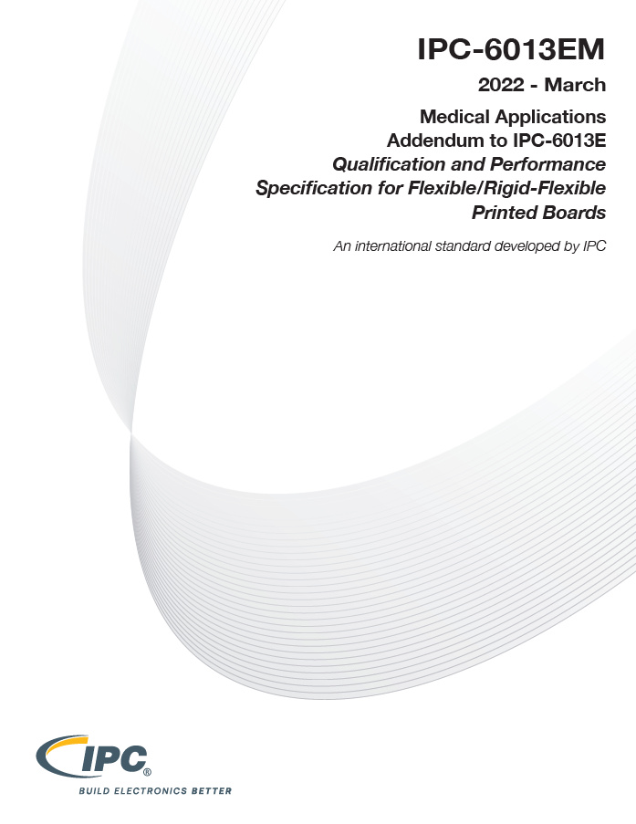 The IPC-6013EM Addendum, when required by procurement documentation/drawings, supplements or replaces specifically identified requirements of IPC-6013E, for flexible/rigid-flexible printed boards that must meet requirements to high reliability medical device applications. IPC-6013EM is the only global industry-consensus standard addendum for Medical Applications to Qualification and Performance Specifications for Flexible/Rigid-Flexible Printed Boards.