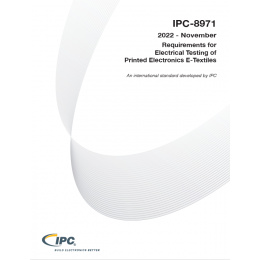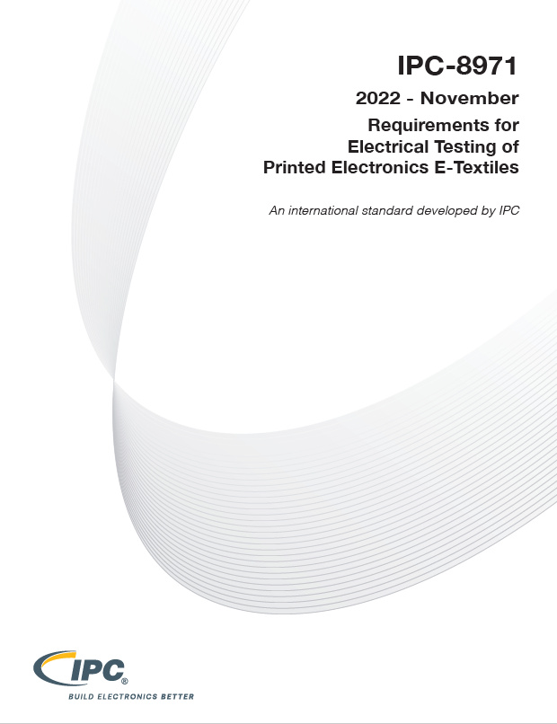 IPC-8971 is intended to assist in selecting the test equipment, test parameters, test data and fixturing required to perform electrical test(s) on printed electronics on e-textiles. Printed electronics on e-textiles is printed electronics on coated or treated textile substrates. Coatings and treatments may be applied for printability of the textile substrate and/or for performance of the textile substrate or finished printed electronics e-textile (e.g., hydrophobic, water retardance, flame retardance, surface energy). Coatings or treatments may be applied using printing, lamination or other processes.