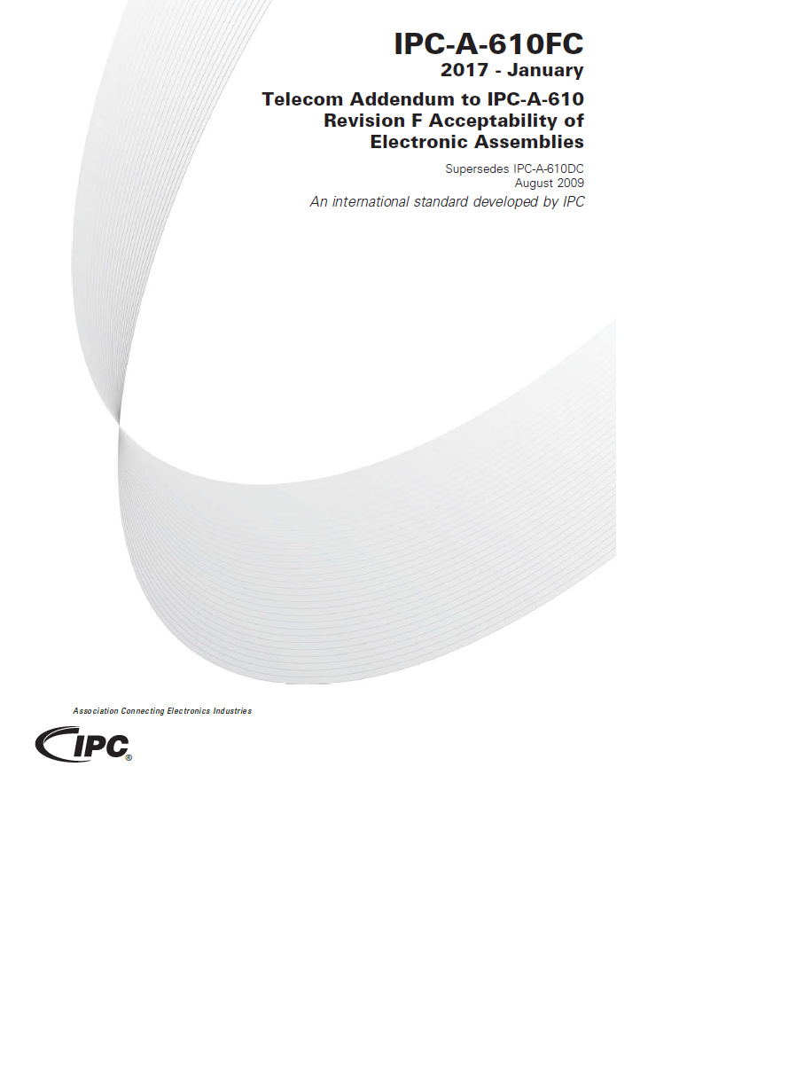 This Telecom Addendum to IPC-A-610F Acceptability of Electronic Assemblies provides specific requirements for telecommunications products when it is specifically required by procurement documentation. Information in this document either supplements or replaces specifically identified requirements of IPC-A-610 Revision F by providing additional requirements to ensure that electrical and electronic assemblies meet requirements for customers requiring GE-78-CORE compliance.