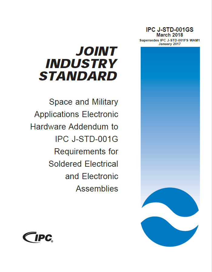 The IPC-J-STD-001GS space addendum supplements or replaces specifically identified requirements of IPC J-STD-001G for soldered electrical and electronic assemblies that must survive the vibration and thermal cyclic environments of getting to and operating in space and military applications.