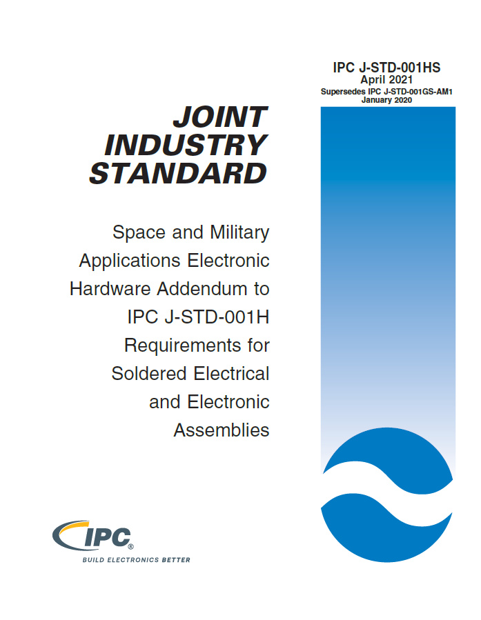 IPC J-STD-001HS space and military addendum, supplements or replaces specifically identified requirements of IPC J-STD-001H requirements for soldered electrical and electronic assemblies that must survive the vibration and thermal cyclic environments of getting to and operating in space and military applications.