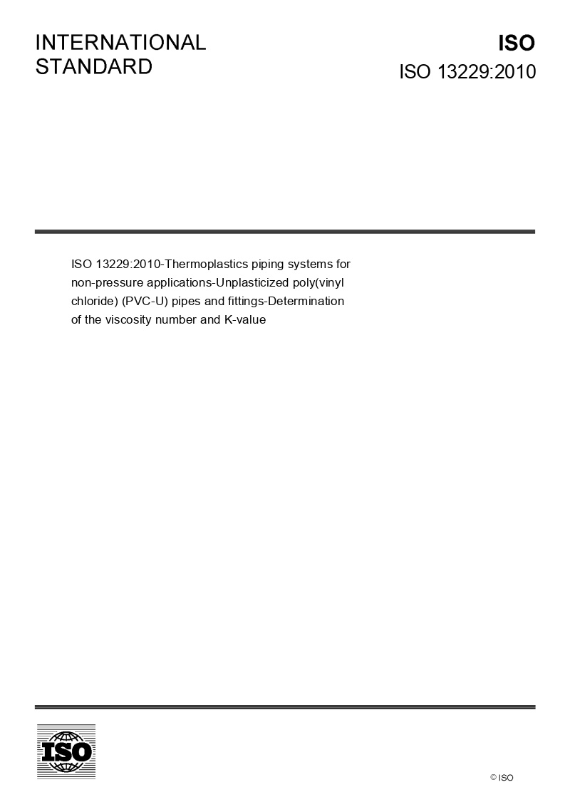ISO 13229:2010 specifies a method for the determination of the viscosity number (also known as reduced viscosity) and K-value of an unplasticized poly(vinyl chloride) (PVC) resin derived from a pipe, fitting or compound.