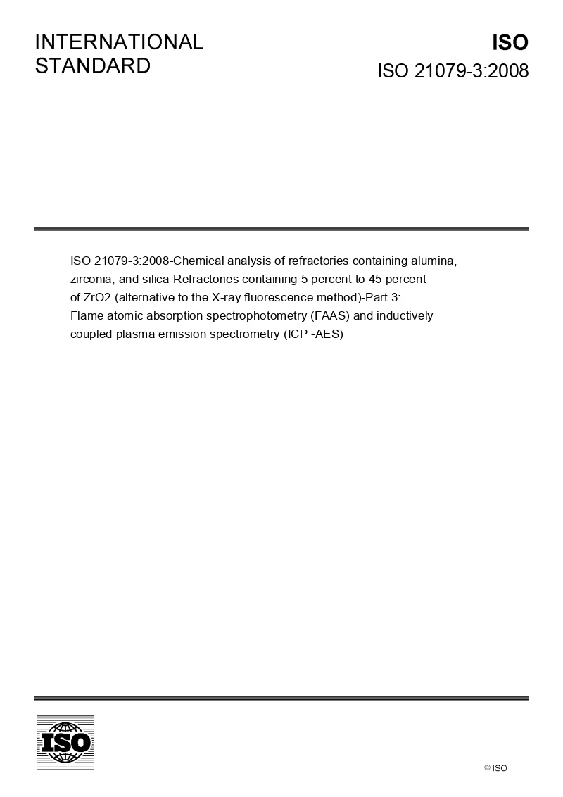 ISO 21079-3:2008-Chemical analysis of refractories containing alumina, zirconia, and silica — Refractories containing 5 percent to 45 percent of ZrO2 (alternative to the X-ray fluorescence method) — Part 3: Flame atomic absorption spectrophotometry (FAAS) and inductively coupled plasma emission spectrometry (ICP -AES)
