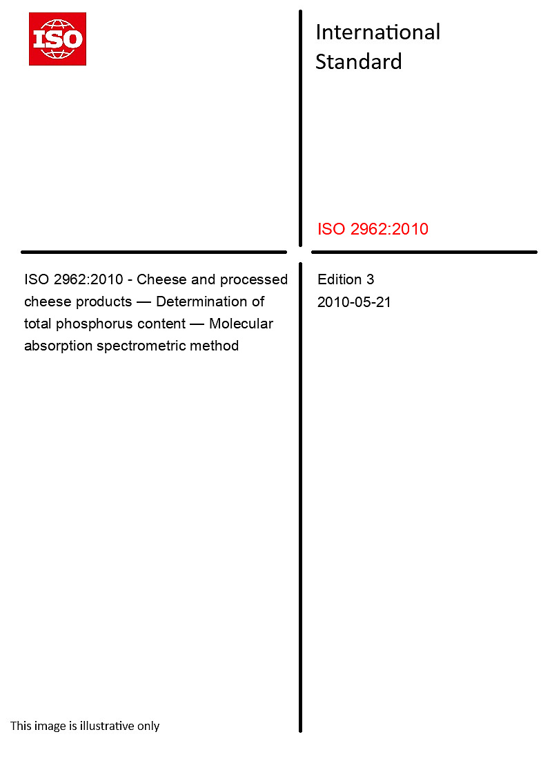 ISO 2962|IDF 33:2010 specifies a molecular absorption spectrometric method for the determination of the total phosphorus content of cheese. The method is applicable to all kinds of cheese and to processed cheese products.