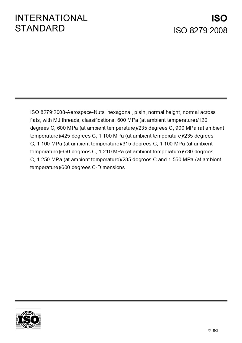 ISO 8279:2008 specifies the dimensions of plain, hexagonal nuts, of normal height, normal across flats, with MJ threads, of classifications: 600 MPa/120 °C, 600 MPa/235 °C, 900 MPa/425 °C, 1 100 MPa/235 °C, 1 100 MPa/315 °C, 1 100 MPa/650 °C, 1 210 MPa/730 °C, 1 250 MPa/235 °C and 1 550 MPa/600 °C. Nuts provided with holes are intended to be used with lockwire in conformity with ISO 245. ISO 8279:2008 is only applicable for the compilation of aerospace product standards.