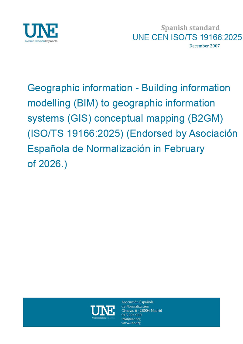 Información geográfica. Modelado de información de construcción (BIM) para mapeo conceptual de sistemas de información geográfica (SIG) (B2GM). (ISO/TS 19166:2025). (Ratificada por la Asociación Española de Normalización en febrero de 2026.)