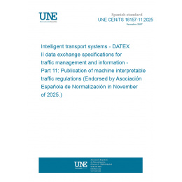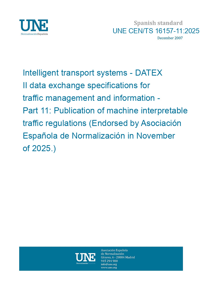 >UNE CEN/TS 16157-11:2025 Intelligent transport systems - DATEX II data exchange specifications for traffic management and information - Part 11: Publication of machine interpretable traffic regulations (Endorsed by Asociación Española de Normalización in November of 2025.)