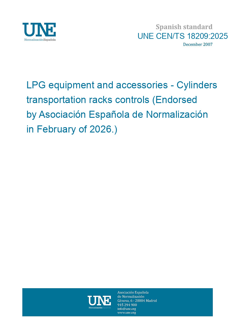 This standard UNE CEN/TS 18209:2025 LPG equipment and accessories - Cylinders transportation racks controls (Endorsed by Asociación Española de Normalización in February of 2026.) is classified in these ICS categories: