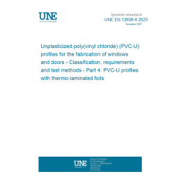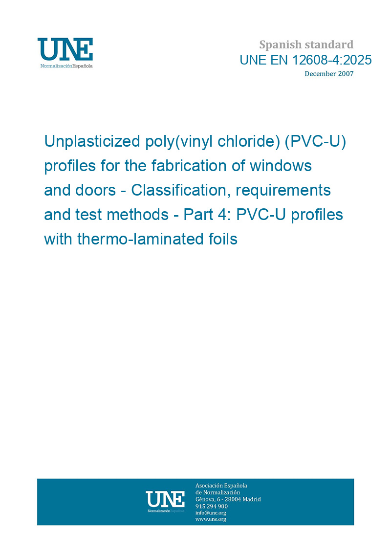 Perfiles de poli(cloruro de vinilo) no plastificado (PVC-U) para la fabricación de ventanas y de puertas. Clasificación, requisitos y métodos de ensayo. Parte 4: Perfiles de PVC-U con películas termolaminadas.