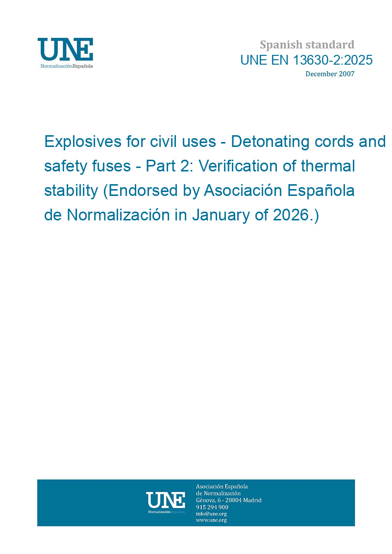 Explosivos para uso civil. Cordones detonantes y mechas de seguridad. Parte 2: Verificación de la estabilidad térmica. (Ratificada por la Asociación Española de Normalización en enero de 2026.)
