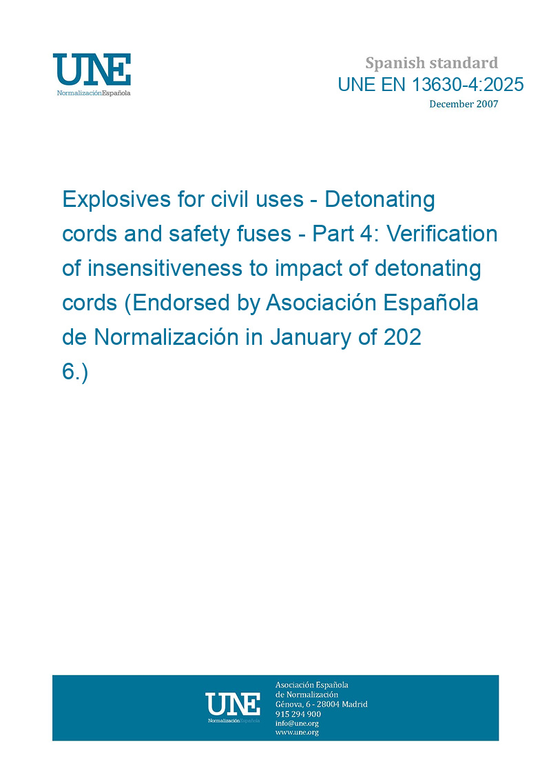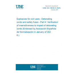 Explosivos para uso civil. Cordones detonantes y mechas de seguridad. Parte 4: Verificación de la sensibilidad al impacto de los cordones detonantes. (Ratificada por la Asociación Española de Normalización en enero de 2026.)