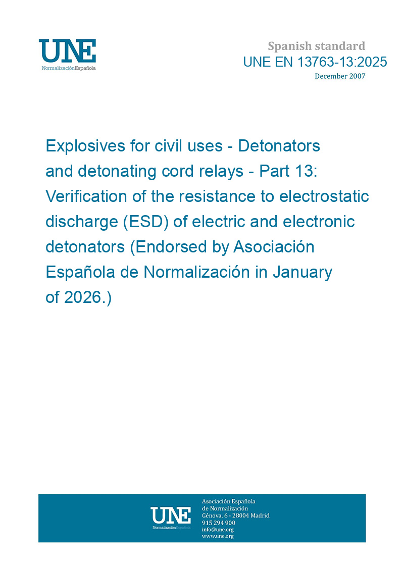 Explosivos para usos civiles. Detonadores y relés de cordón detonante. Parte 13: Verificación de la resistencia a descargas electrostáticas de detonadores eléctricos y electrónicos. (Ratificada por la Asociación Española de Normalización en enero de 2026.)