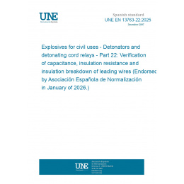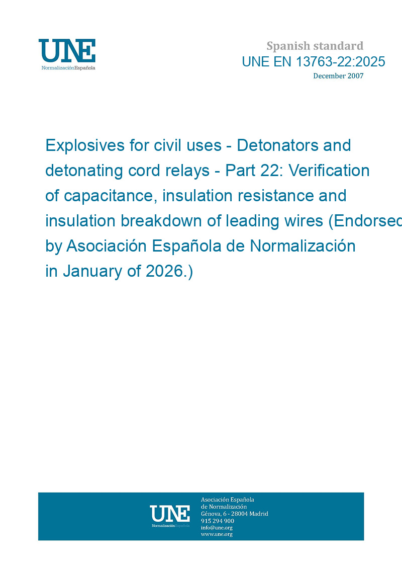 Explosivos para usos civiles. Detonadores y relés de cordón detonante. Parte 22: Verificación de capacitancia, resistencia de aislamiento y ruptura de aislamiento de hilos conductores (Ratificada por la Asociación Española de Normalización en enero de 2026.)