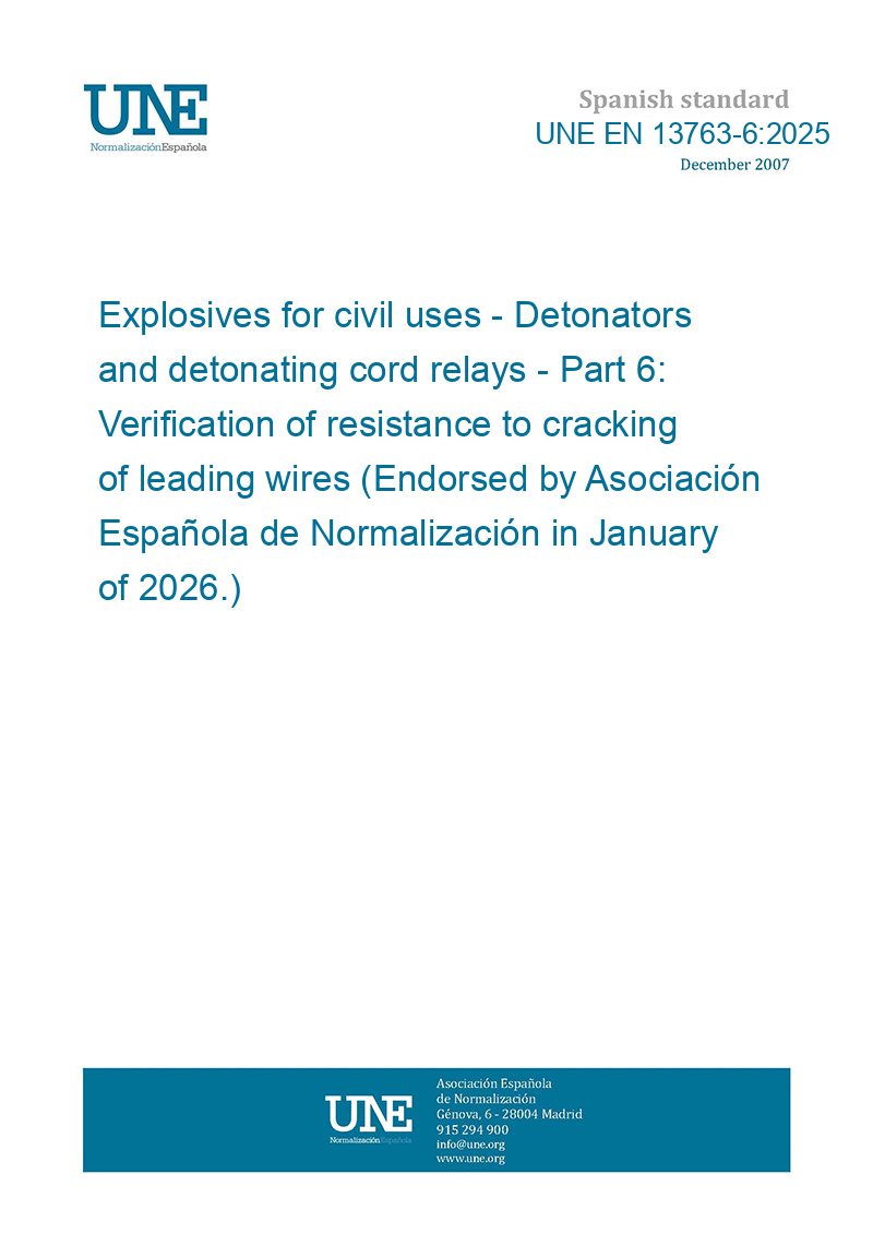 Explosives for civil uses - Detonators and detonating cord relays - Part 6: Verification of resistance to cracking of leading wires (Endorsed by Asociación Española de Normalización in January of 2026.)