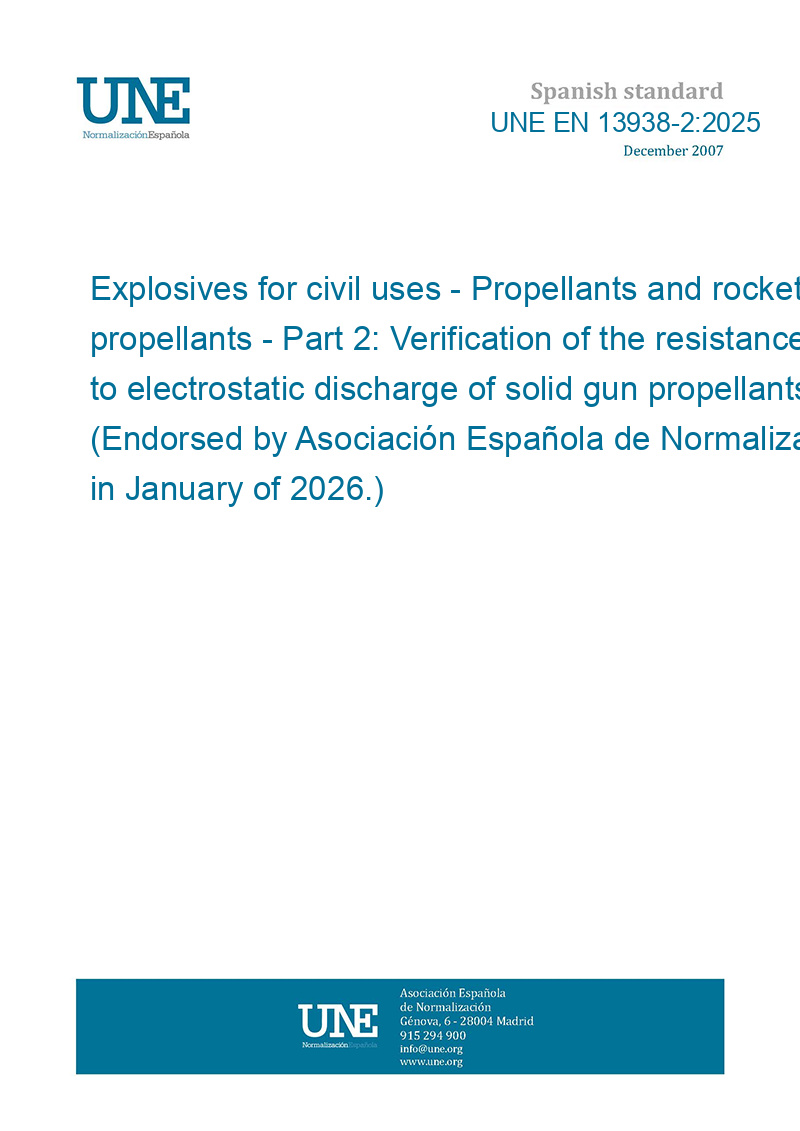 Explosivos para usos civiles. Propulsantes y propulsantes para cohetes. Parte 2: Verificación de la resistencia a la descarga electrostática de propulsantes sólidos para armas (Ratificada por la Asociación Española de Normalización en enero de 2026.)