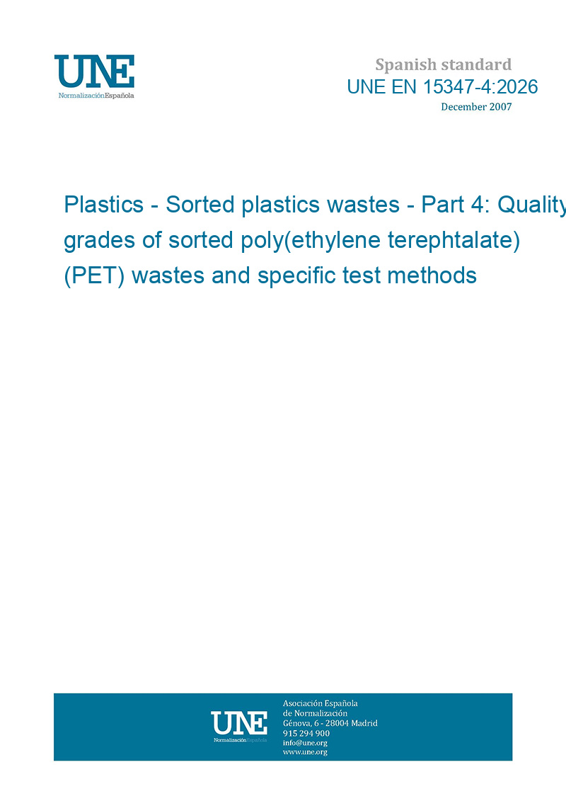 Plásticos. Residuos plásticos clasificados. Parte 4: Grados de calidad de los residuos plásticos de poli(tereftalato de etileno) (PET) clasificados y métodos de ensayo específicos.