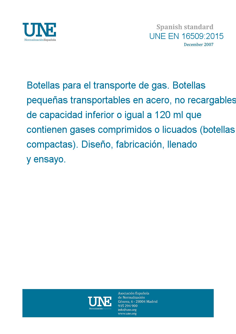 Botellas para el transporte de gas. Botellas pequeñas transportables en acero, no recargables, de capacidad inferior o igual a 120 ml que contienen gases comprimidos o licuados (botellas compactas). Diseño, fabricación, llenado y ensayo.