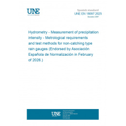 This standard UNE EN 18097:2025 Hydrometry - Measurement of precipitation intensity - Metrological requirements and test methods for non-catching type rain gauges (Endorsed by Asociación Española de Normalización in February of 2026.) is classified in these ICS categories: