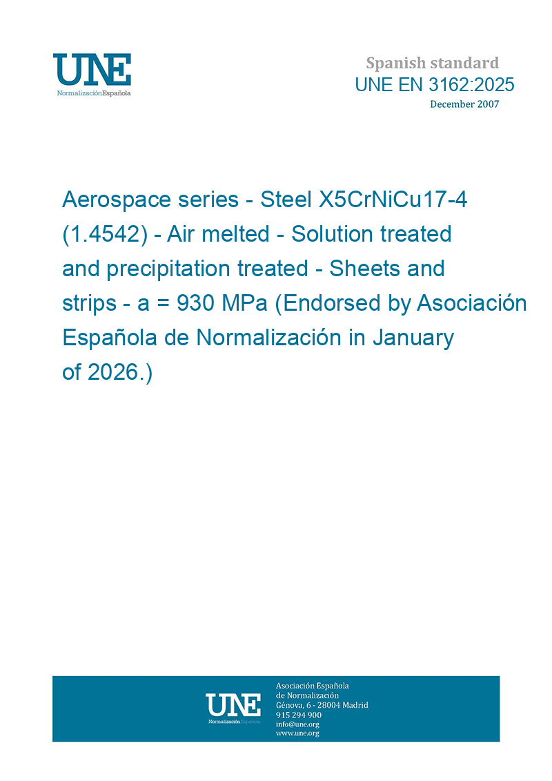 Material aeroespacial. Acero X5CrNiCu17-4 (1.4542). Fundido al aire. Tratado en solución y precipitación. Chapas y bandas a <= 6 mm - Rm >= 930 MPa (Ratificada por la Asociación Española de Normalización en enero de 2026.)