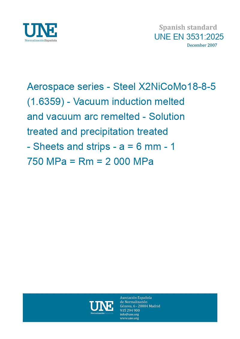 Material aeroespacial. Acero X2NiCoMo18-8-5 (1.6359). Fundido en vacío y refundido por arco en vacío. Tratado en solución y precipitación. Chapas y bandas a <= 6 mm - 1 750 MPa <= Rm <= 2 000 MPa (Ratificada por la Asociación Española de Normalización en octubre de 2025.)