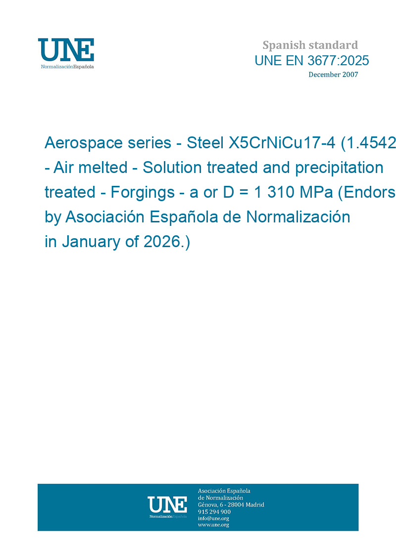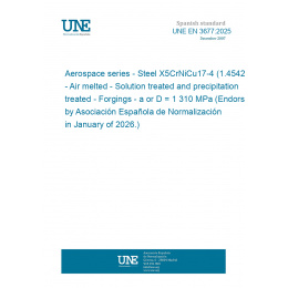 Aerospace series - Steel X5CrNiCu17-4 (1.4542) - Air melted - Solution treated and precipitation treated - Forgings - a or D <= 200 mm - Rm >= 1 310 MPa (Endorsed by Asociación Española de Normalización in January of 2026.)