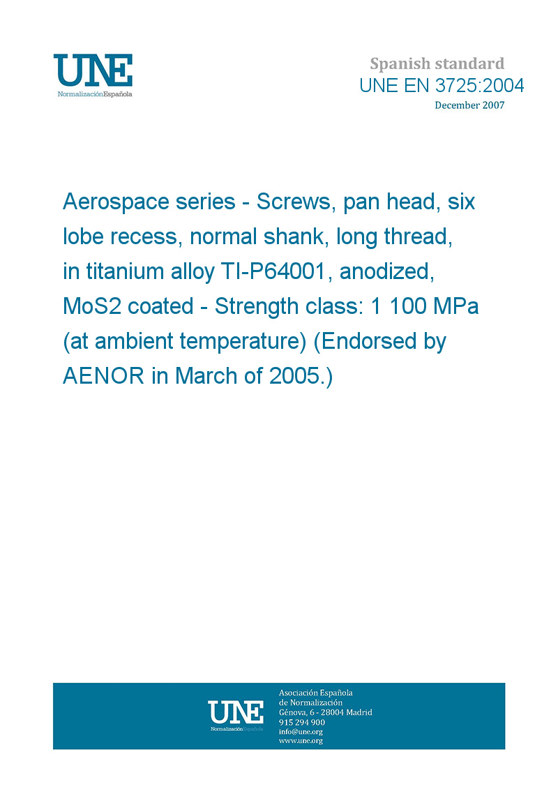 This standard UNE EN 3725:2004 Aerospace series - Screws, pan head, six lobe recess, normal shank, long thread, in titanium alloy TI-P64001, anodized, MoS2 coated - Strength class: 1 100 MPa (at ambient temperature) (Endorsed by AENOR in March of 2005.) is classified in these ICS categories:
