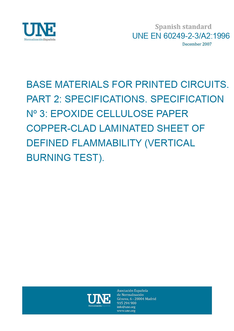 This standard UNE EN 60249-2-3/A2:1996 BASE MATERIALS FOR PRINTED CIRCUITS. PART 2: SPECIFICATIONS. SPECIFICATION Nº 3: EPOXIDE CELLULOSE PAPER COPPER-CLAD LAMINATED SHEET OF DEFINED FLAMMABILITY (VERTICAL BURNING TEST). is classified in these ICS categories: