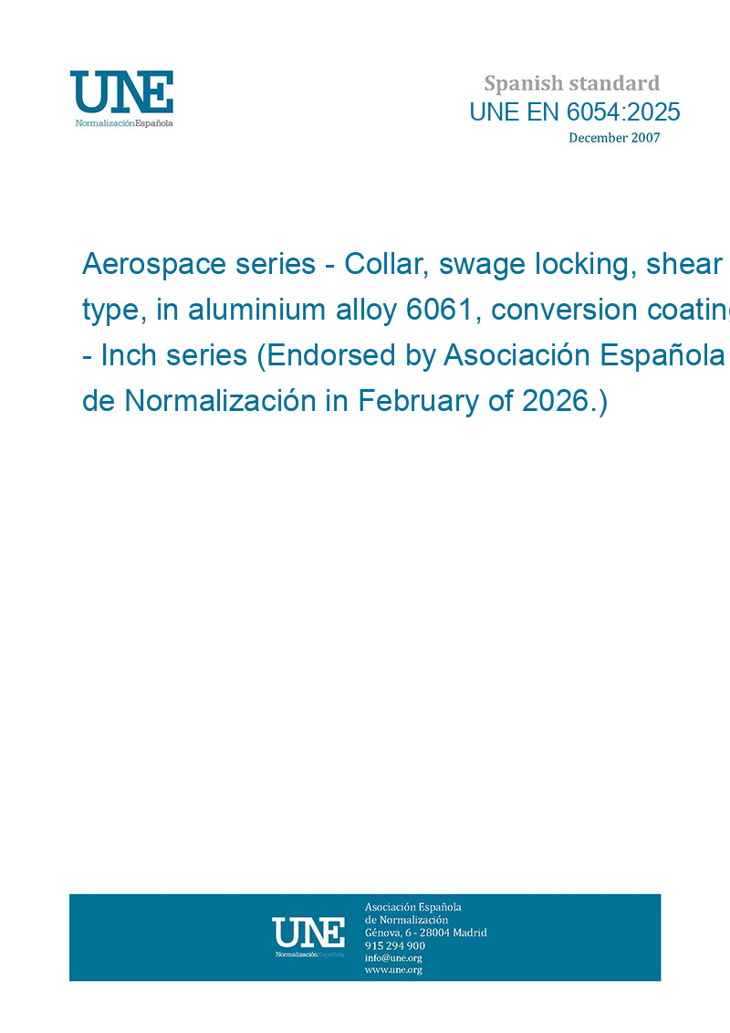 This standard UNE EN 6054:2025 Aerospace series - Collar, swage locking, shear type, in aluminium alloy 6061, conversion coating - Inch series (Endorsed by Asociación Española de Normalización in February of 2026.) is classified in these ICS categories: