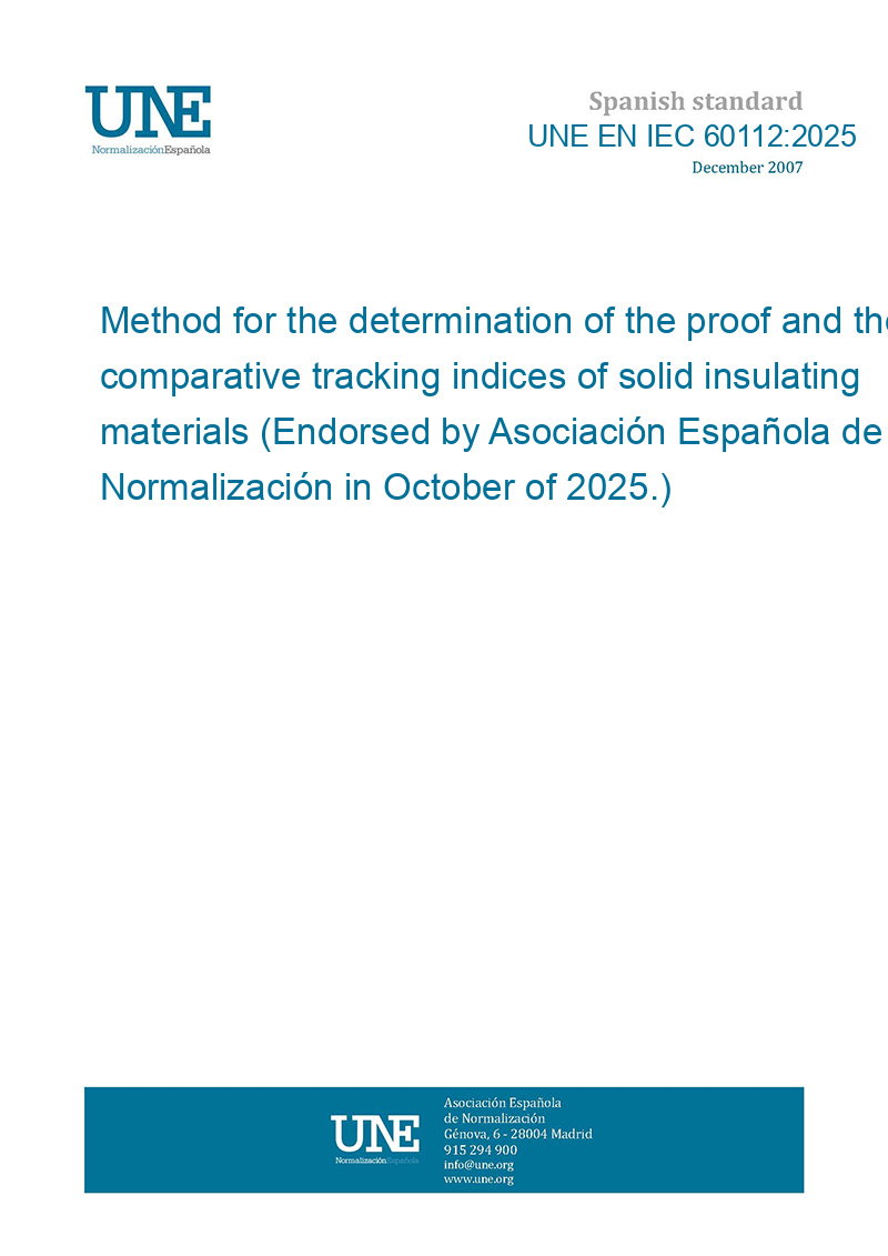 This standard UNE EN IEC 60112:2025 Method for the determination of the proof and the comparative tracking indices of solid insulating materials (Endorsed by Asociación Española de Normalización in October of 2025.) is classified in these ICS categories: