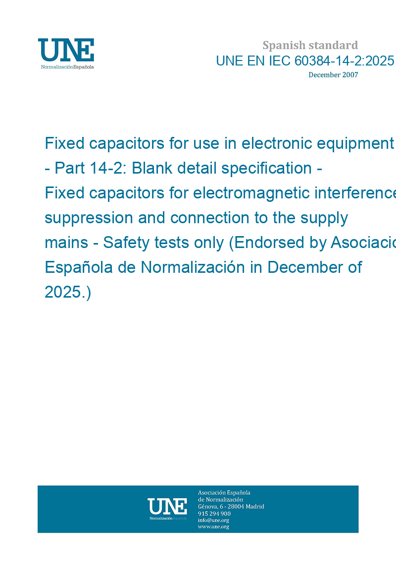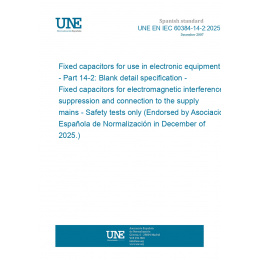 Fixed capacitors for use in electronic equipment - Part 14-2: Blank detail specification - Fixed capacitors for electromagnetic interference suppression and connection to the supply mains - Safety tests only (Endorsed by Asociación Española de Normalización in December of 2025.)