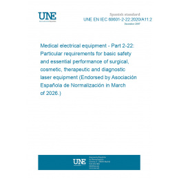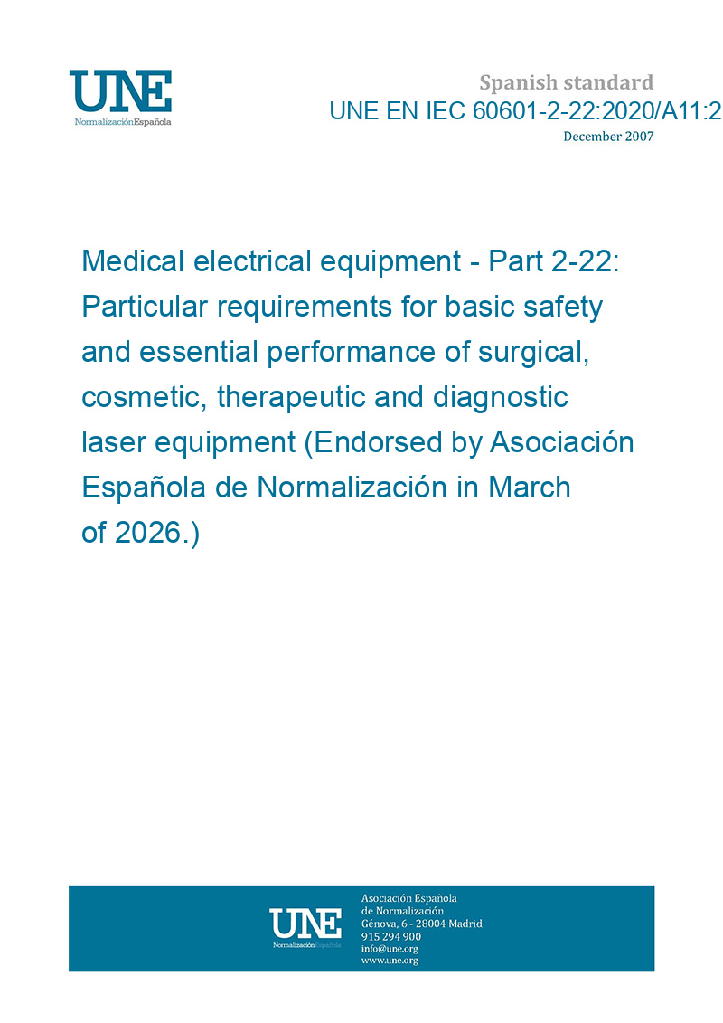 Equipos electromédicos. Parte 2-22: Requisitos particulares para la seguridad básica y el funcionamiento esencial de los equipos láser quirúrgicos, cosméticos, terapéuticos y de diagnóstico. (Ratificada por la Asociación Española de Normalización en marzo de 2026.)