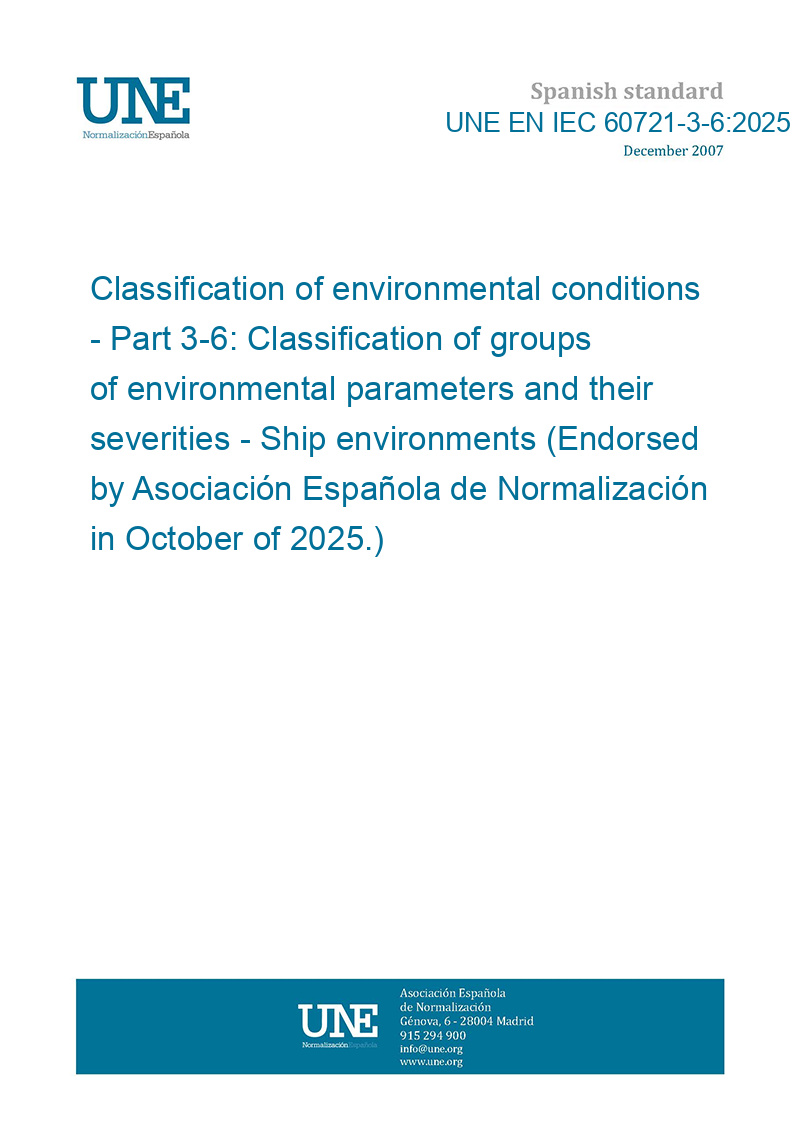 Clasificación de las condiciones ambientales. Parte 3-6: Clasificación de los grupos de parámetros ambientales y sus severidades. Ambiente de barcos. (Ratificada por la Asociación Española de Normalización en octubre de 2025.)