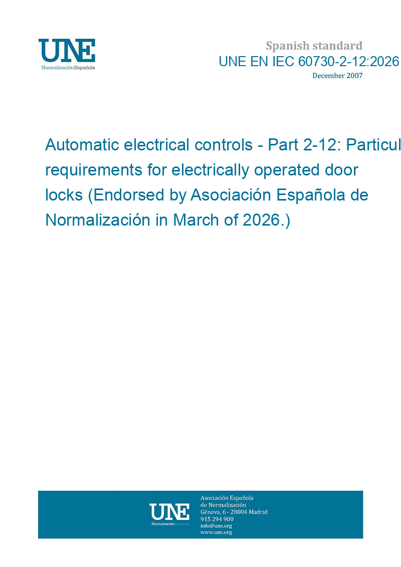 Dispositivos de control eléctrico automático. Parte 2-12: Requisitos particulares para bloqueadores eléctricos de puertas. (Ratificada por la Asociación Española de Normalización en marzo de 2026.)