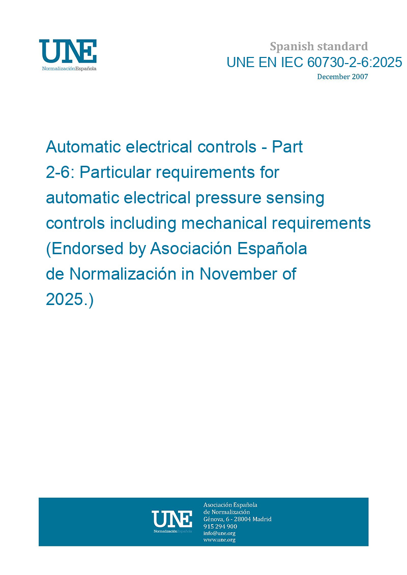 Dispositivos de control eléctrico automático. Parte 2-6: Requisitos particulares para dispositivos de control eléctrico automático sensibles a la presión incluyendo requisitos mecánicos. (Ratificada por la Asociación Española de Normalización en noviembre de 2025.)