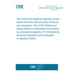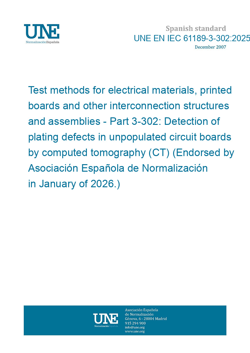 Métodos de ensayo para materiales eléctricos, tarjetas impresas y otras estructuras y montajes de interconexión. Parte 3-302: Detección de defectos de chapado en placas de circuito impreso despobladas mediante tomografía computerizada (TC). (Ratificada por la Asociación Española de Normalización en enero de 2026.)