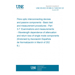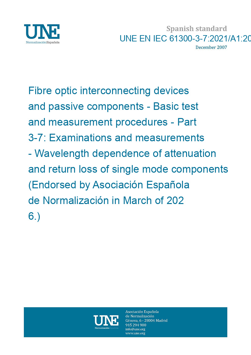 Dispositivos de interconexión de fibra óptica y componentes pasivos. Ensayos básicos y procedimientos de medida. Parte 3-7: Inspecciones y medidas. Dependencia de la atenuación y de la pérdida de retorno con la longitud de onda de componentes monomodo. (Ratificada por la Asociación Española de Normalización en marzo de 2026.)