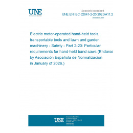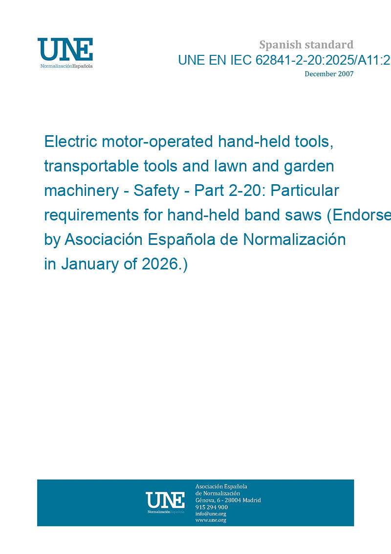 Herramientas portátiles, semifijas y maquinaria de jardinería y cortacéspedes, accionadas por motor eléctrico. Seguridad. Parte 2-20: Requisitos particulares para sierras de cinta portátiles. (Ratificada por la Asociación Española de Normalización en enero de 2026.)
