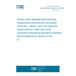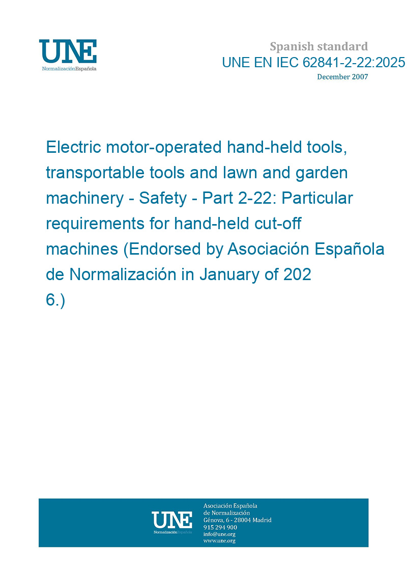 Electric motor-operated hand-held tools, transportable tools and lawn and garden machinery - Safety - Part 2-22: Particular requirements for hand-held cut-off machines (Endorsed by Asociación Española de Normalización in January of 2026.)