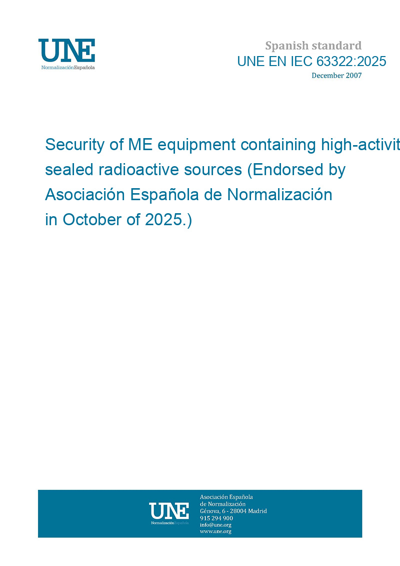 This standard UNE EN IEC 63322:2025 Security of ME equipment containing high-activity sealed radioactive sources (Endorsed by Asociación Española de Normalización in October of 2025.) is classified in these ICS categories: