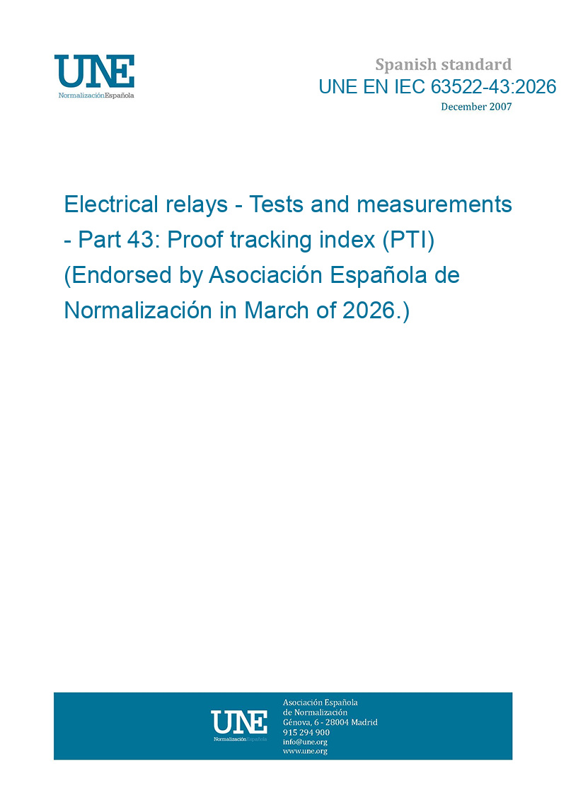 This standard UNE EN IEC 63522-43:2026 Electrical relays - Tests and measurements - Part 43: Proof tracking index (PTI) (Endorsed by Asociación Española de Normalización in March of 2026.) is classified in these ICS categories:
