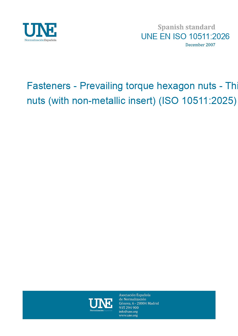 This standard UNE EN ISO 10511:2026 Fasteners - Prevailing torque hexagon nuts - Thin nuts (with non-metallic insert) (ISO 10511:2025) is classified in these ICS categories: