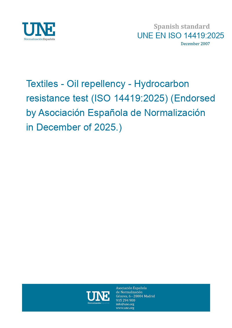 Textiles. Repelencia al aceite. Ensayo de resistencia a los hidrocarburos. (ISO 14419:2025) (Ratificada por la Asociación Española de Normalización en diciembre de 2025.)