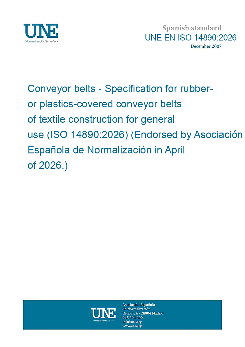 Cintas transportadoras. Especificación para cintas transportadoras con recubrimiento de caucho o plásticos de núcleo textil para uso general (ISO 14890:2026) (Ratificada por la Asociación Española de Normalización en abril de 2026.)