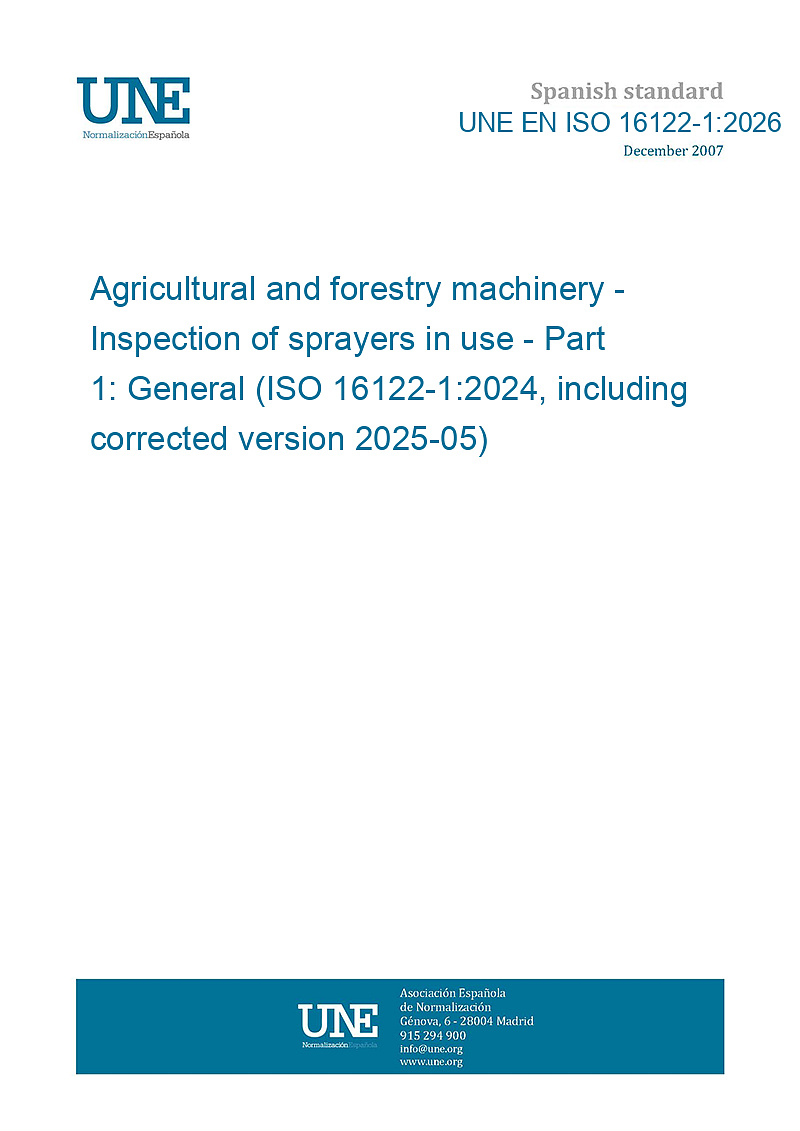 >UNE EN ISO 16122-1:2026 - Agricultural and forestry machinery - Inspection of sprayers in use - Part 1: General (ISO 16122-1:2024, including corrected version 2025-05)